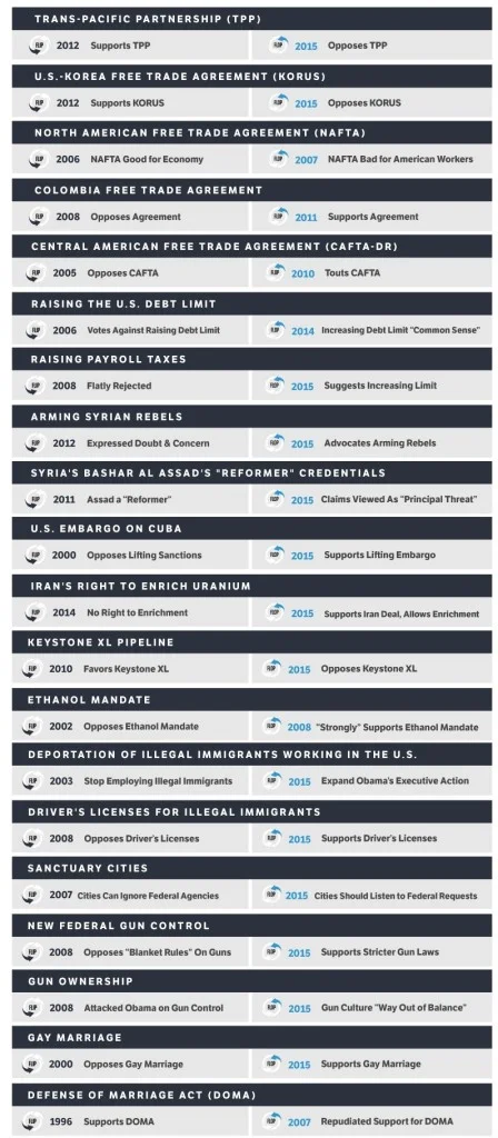 Here are seven of Clinton’s biggest flip-flops:1. Gay Marriage.